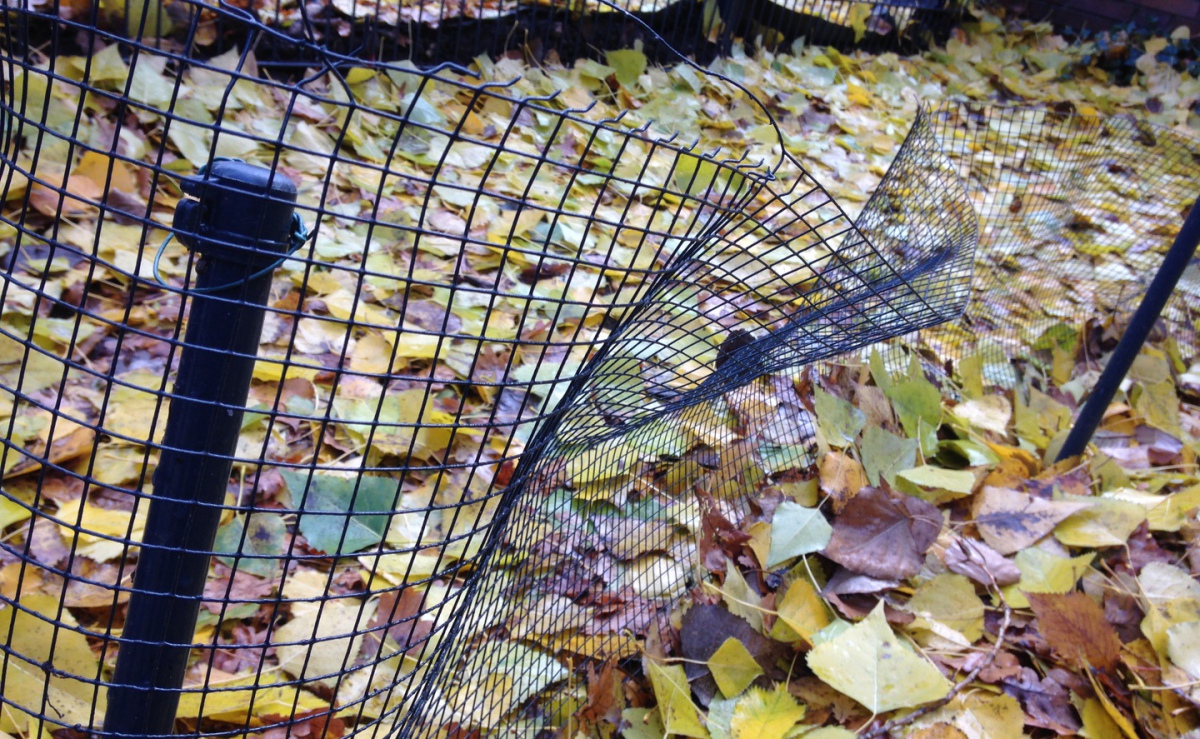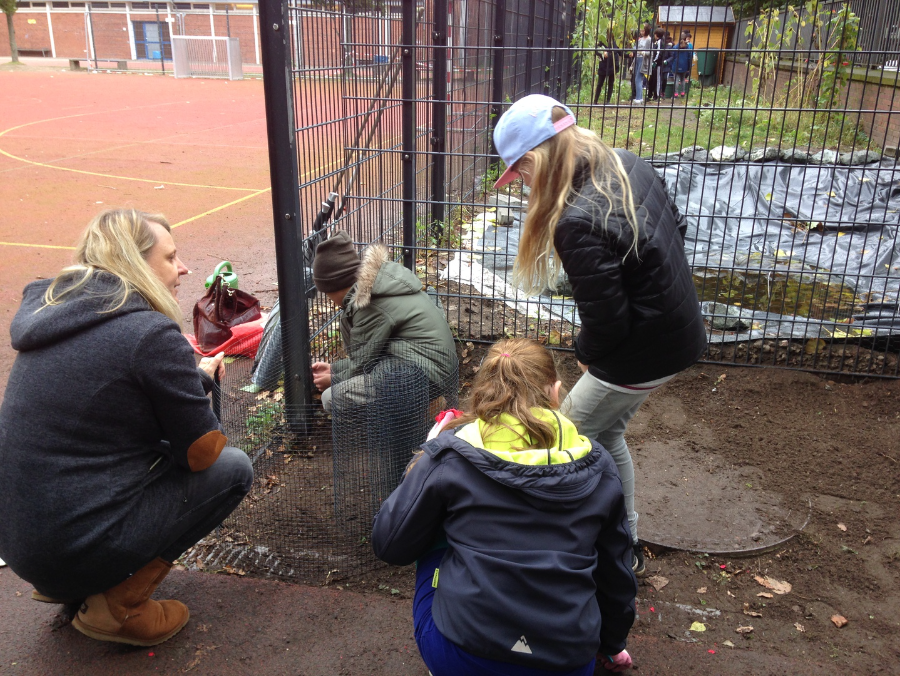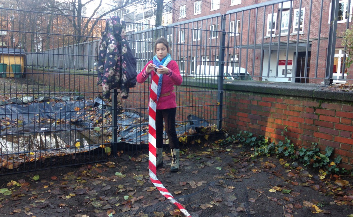 Um das Beet vor Fußballern zu schützen, haben wir den Kaninchendraht mit Absperrband umwickelt!
