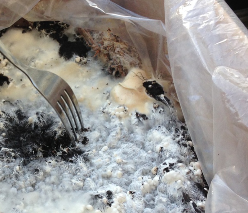 Wir wässern mit nur wenigen Tropfen ganz vorsichtig unsere Champignonzucht.